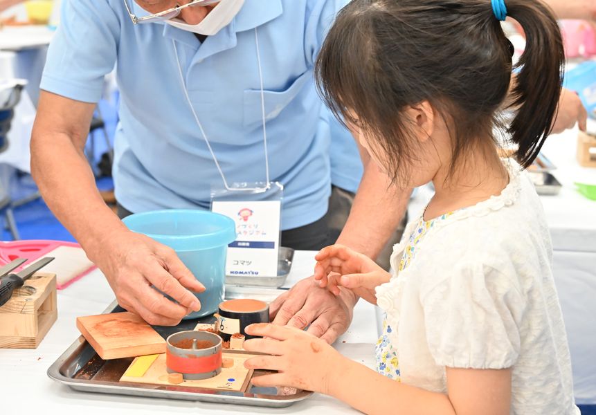 建設機械を構成する鋳物を知ってもらおうという企画。 同社OBが地域の子どもたちを指導する、わくわくコマツ館(石川県小松市)でのプログラムを持ち込んだ。比較的低温で溶ける金属を金型に流し込み、冷やした後に表面を加工してキーホルダーを制作しました。参加した小学生は「もっと何回でもやりたい」と大喜び。