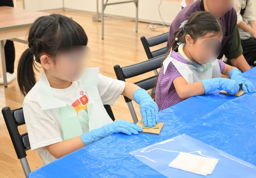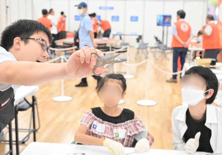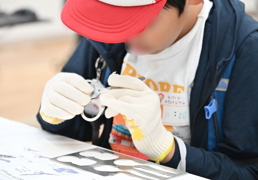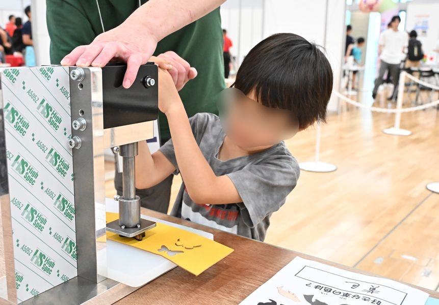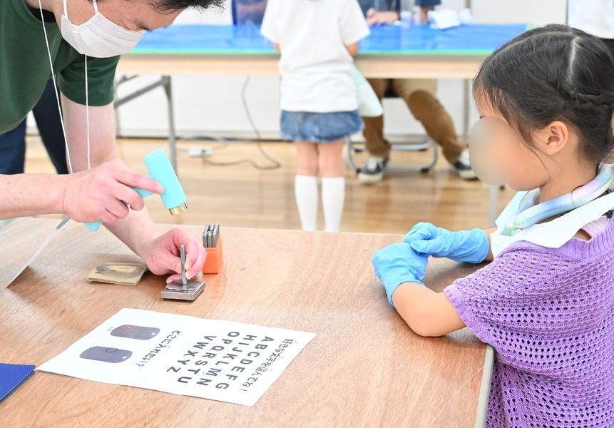 金属プレートに刻印や磨きを行い、型抜いた革とともにキーホルダーを作る。同社はこれまでオープンファクトリーや出前授業を行っていたが、体験プログラムは初めての試み。部署一丸となって工程を考案。参加した小学4年生の女の子は「金属を磨く工程が一番楽しかった」とし、自作のキーホルダーを喜んで持ち帰った。