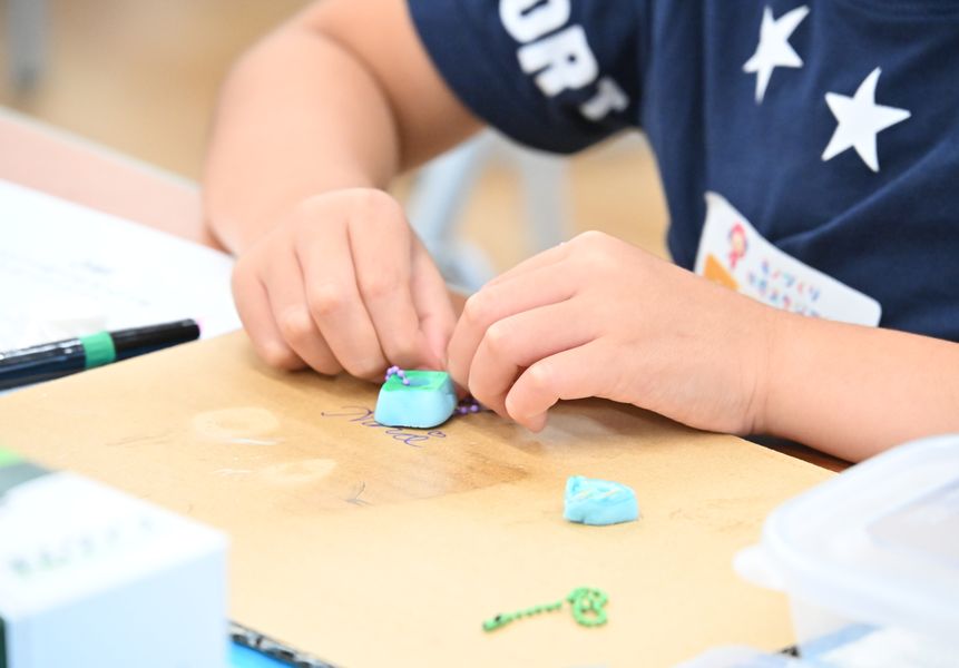 モノづくりを支える金型についてレクチャーし、さらに金型を加工するために超硬工具の作り方を学ぶ。今回はタングステンやコバルトといった金属ではなく、粘土をドライヤーで加熱して固め、刃先交換チップ(インサート)を模した形にして、キーホルダーを製作した。思い思いに採色するなどして作ったオリジナルのキーホルダーは、子どもたちの宝物。