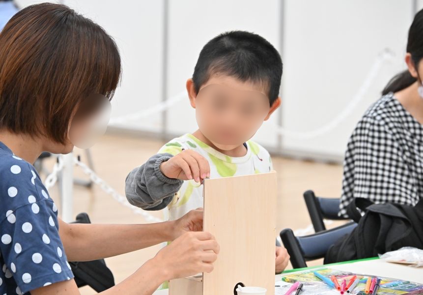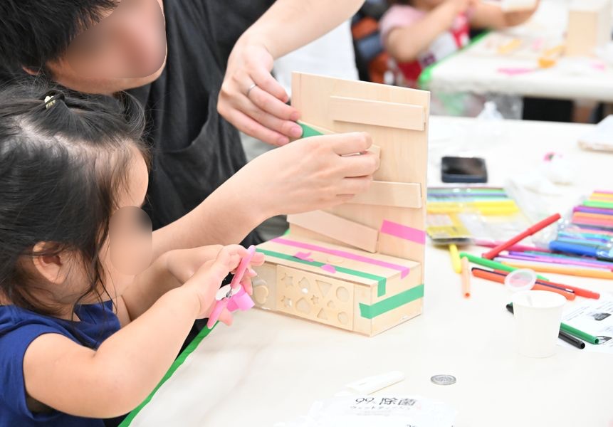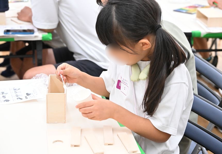 木材を綿棒を使って接着し組み合わせ、カラーペンやテープなどで自由に装飾する。思い思いのデザインを施し、モノづくりを楽しみました。参加した保護者は「子どもが工作好きでこのプログラムを選んだ」と親子で体感した。