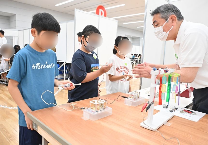 生活に身近な乾電池、磁石などを用いた単極モーター製作や「回転するアルミの卵」「大江戸線リニア模型」など、10種類以上の理科実験を体験できる小学生プログラム。電気学会が認定したメンバーが小中学校を中心に科学の楽しさを知ってもらおうと活動している。モーターの原理を使った実験は、同伴した保護者も楽しそうに体験。小学4年生の女子のお父さんは「家で動画を参考にモーターを作ろうとしたが失敗。リベンジでき良かった」とうれしそう。