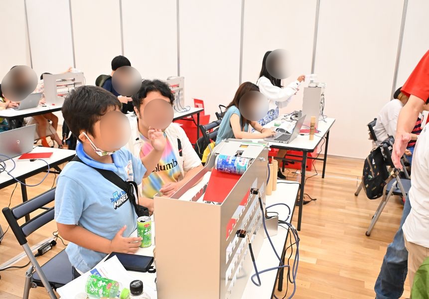 ゴミ箱にペットボトルと金属缶を廃棄する際に投入後自動的に分別される仕組みを学んだ。材質の違いをセンサーが検知し、そのプログラムも子どもたちが組み上げる。参加者は「分別するには工夫が必要だということがわかった」と納得の様子。