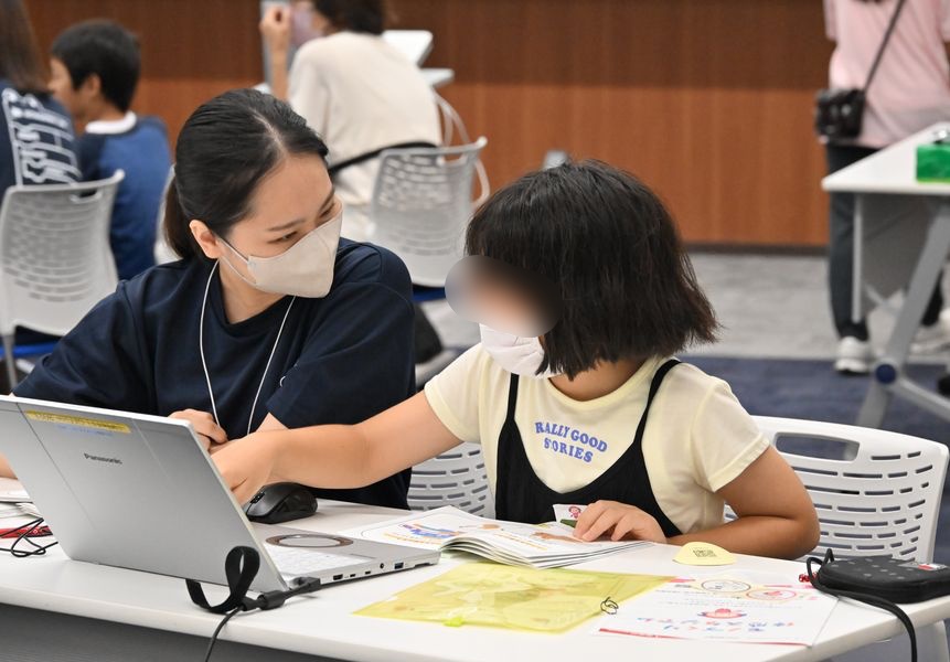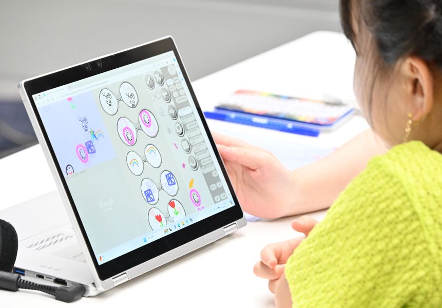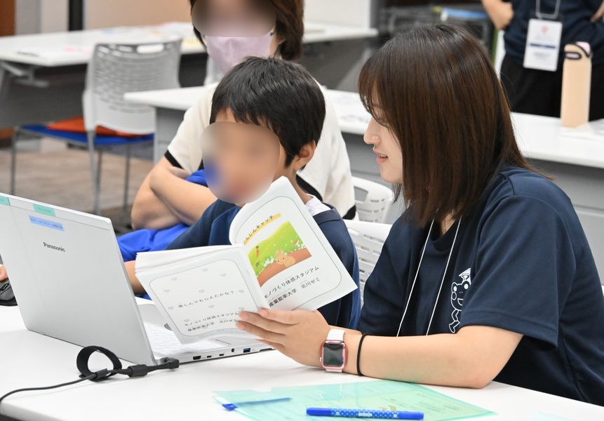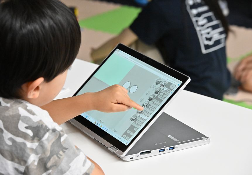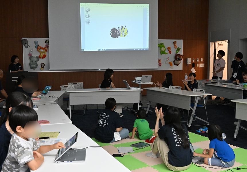 ゼミの学生が子どもたちにマンツーマンでプログラミングの楽しさを伝えた。5歳から小学1年生はビジュアルプログラミングツールを使い、タブレットで動物を描き、動かした。最後に参加者の作品を合わせて「動物園」を作成すると、会場からは大きな拍手。
