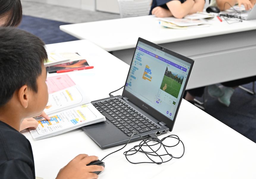 教育用プログラミングツールで画面上部から落ちるアイテムをキャッチするゲームを制作。プログラミング初体験の男子小学生は「楽しかった。1時間では足りない。あと24時間できる」と笑顔。