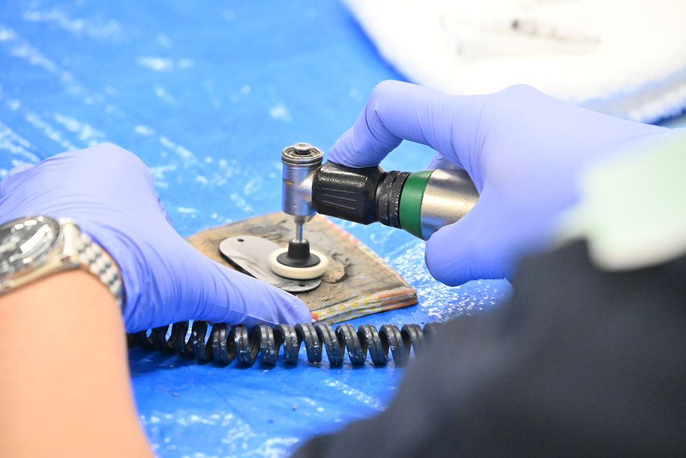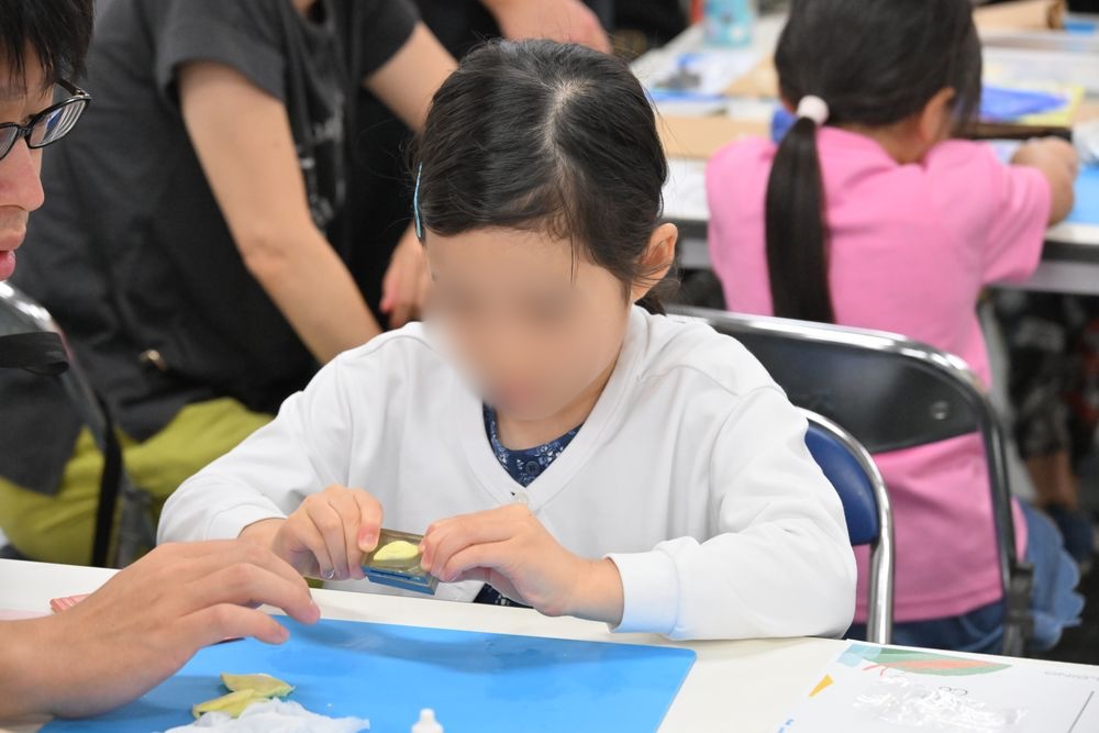 超硬工具の役割を、映像や体験を通じて学ぶプログラム。モノづくりを支える金型について解説したほか、粘土をドライヤーで加熱して固め、超硬工具に関するツールを模したキーホルダーづくりに挑戦。粘土を型に入れる工程では、親子が協力する光景もあった。自由に色を塗って完成したキーホルダーを子どもたちは喜んで持ち帰った。東京都から来た6歳の女の子は「型に入れたり色を塗ったりするのが楽しかった」と顔をほころばせた。