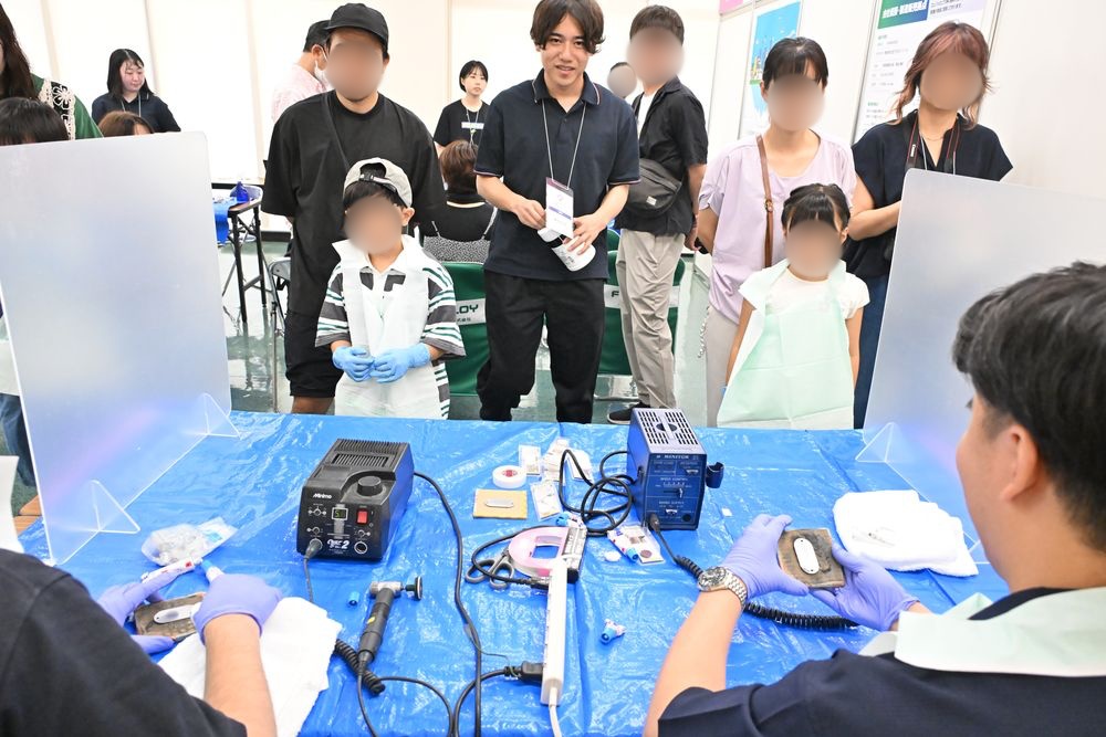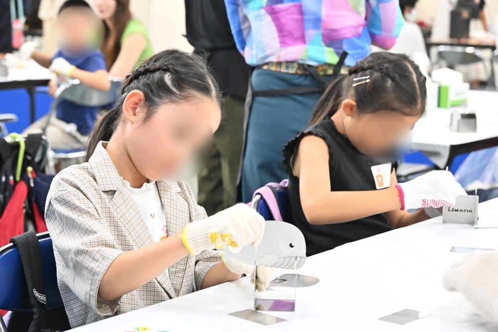 子どもたちに板金加工を知ってもらおうと、金属板を使ったクジラ型のペン立てとオリジナルチャームの製作に挑戦してもらった。子どもたちは力の要る作業を家族に助けてもらい、完成すると親子揃って満面の笑み。チャームづくりでは、酸化被膜の作用でチャームが自分の選んだ色に変わる様子に興味津々。東京都から父親らと訪れた小学4年生の女の子は「色が変わる様子が見られて楽しかった」と、うれしそうにチャームを撫でた。