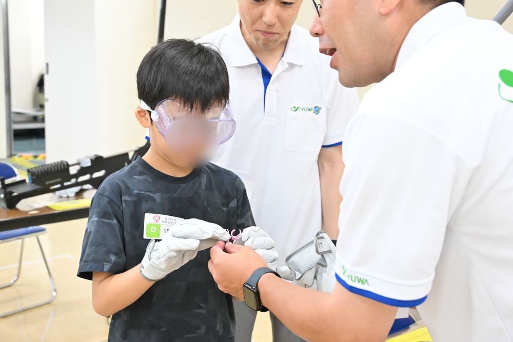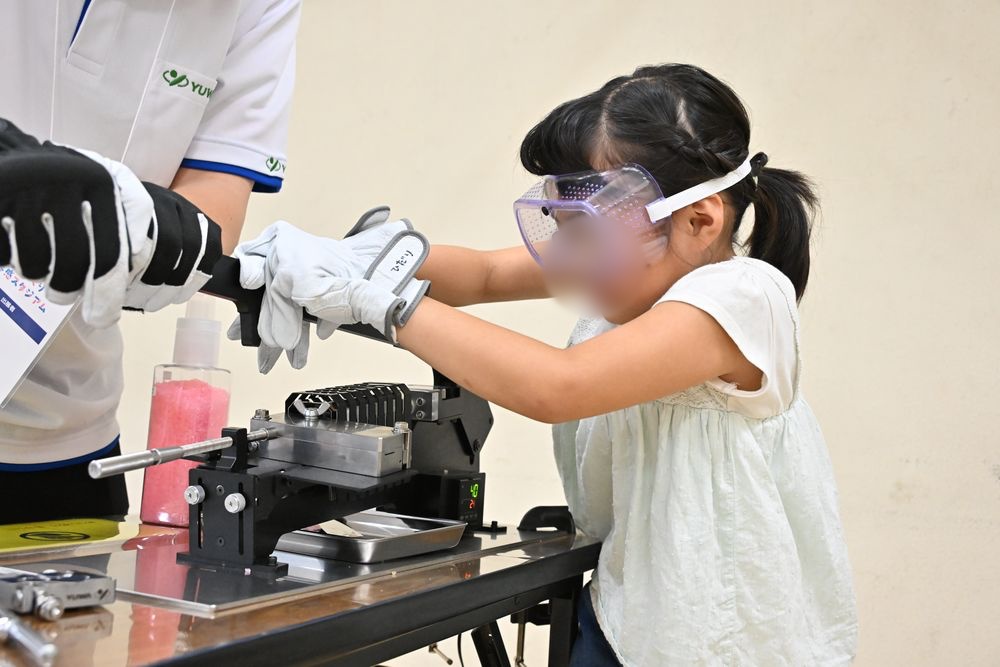 子どもたちに小型の射出成形機を作ったプラスチック製品づくりを体験してもらった。安全を徹底するため、ゴーグルやグローブも用意し、装着した子どもたちもどこか興奮気味。「さらさらした素材がドロドロになり、それがリボンや車など、いろいろな形に変わって驚いた」と、神奈川県から両親、弟と一緒に訪れた小学6年生の女の子。材料になったペットボトルのキャップを見返していた。資源循環も同時に感じたようだ。