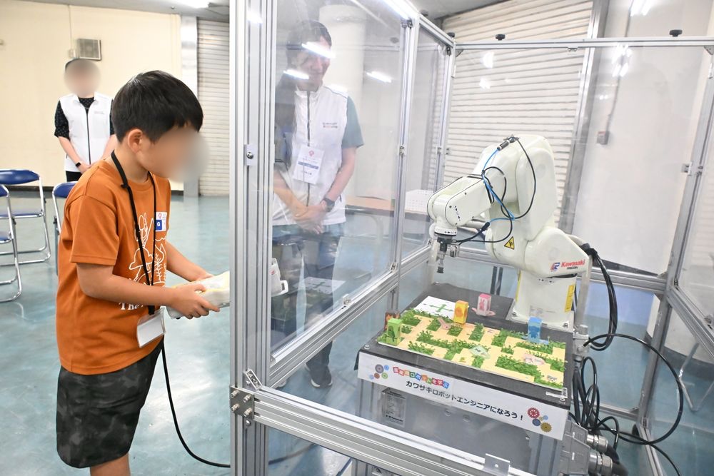 産業用ロボットに触れる機会がない子どもたちにとって貴重な体験になったようだ。子どもたちはロボットの軸がどんな動きをするかの説明を受けつつ、ロボットを操作する主観を待ちきれない様子。実際の操作は、家庭用ゲーム機での操作に慣れはあるものの、どこか勝手が違うよう。父親と東京都から訪れた小学4年生の男の子は「ロボットを操作する装置が重かったけど楽しかった」と、お土産の缶バッチを手に体験を振り返った。