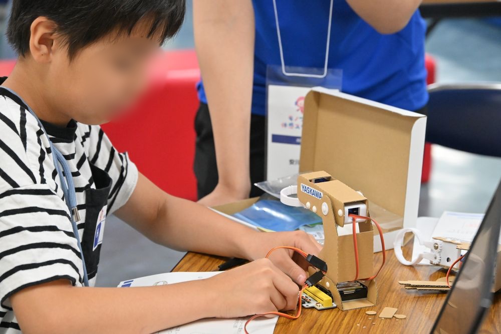 安川電機のプログラムは、段ボール製のロボットアームを組み立て、作成したプログラムを装備し、実際にロボットを動かして作業させる。作業は自作のアームでピンポン球を一方のボール置き台からもう一方に移動させるのだが、これが見るからに難しそう。子どもたちは集中し、プログラムを微妙に修正しつつ、次々とミッションクリア。手に汗握る瞬間に作業する子どもたちより、むしろ見守る家族が緊張する場面が印象深い。