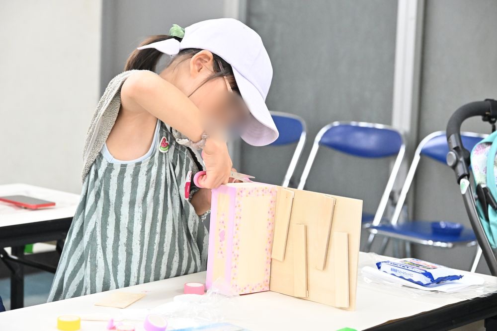 子どもたちに挑戦してもらったプログラムは、貯金箱と募金箱を組み合わせて名付けた「ちょぼきんばこ」の工作。コインを入れると、レールに沿ってコロコロと転がりながら箱の中に落ちる仕組みで見ていて楽しい。子どもたちは家族に見守られる中、思い思いにペンやテープで飾り付けしつつ、楽しそうに組み立てた。川上博史会長から「工作の達人認定証」を手渡されると、うれしそうにはにかむ姿も見られた。