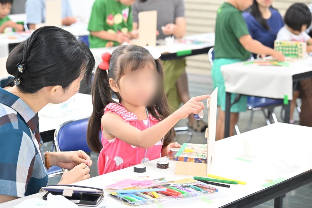 「ちょぼきんばこ」の名前の由来から募金の大切さを学べて、実際にいろいろな動く貯金箱に入れて楽しめたり、子どもにもわかりやすく楽しく木工作をしながらオリジナルのちょぼきんばこが作れて、親子でとても楽しめました!
