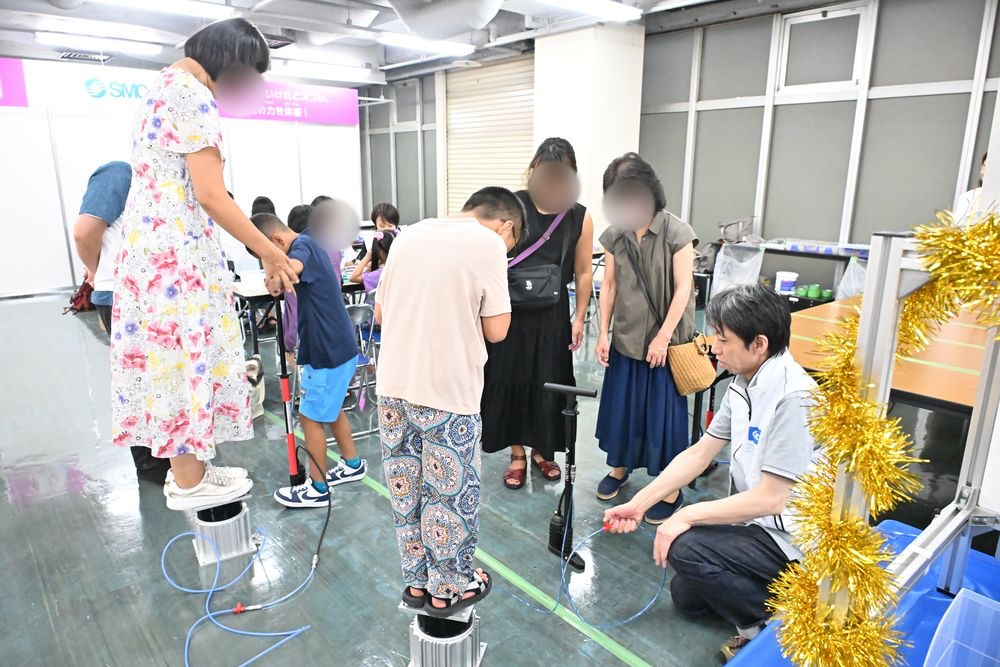 子どもたちが空気の力を体感する良い機会になったようだ。空気を送り込んだエアシリンダーが大人を持ち上げたり、空気圧がクレーンゲームのアームを動かしたりする姿に大喜び。また、ペットボトルに車輪を付けたペットボトルカーを工作。空気を送り込んで一気に解放すると、勢いよく飛び出していく姿に親子揃って歓声を上げた。父親と東京都から訪れた小学3年生の男の子は「もう1回やりたい」と、空気の力の虜になったようだ。