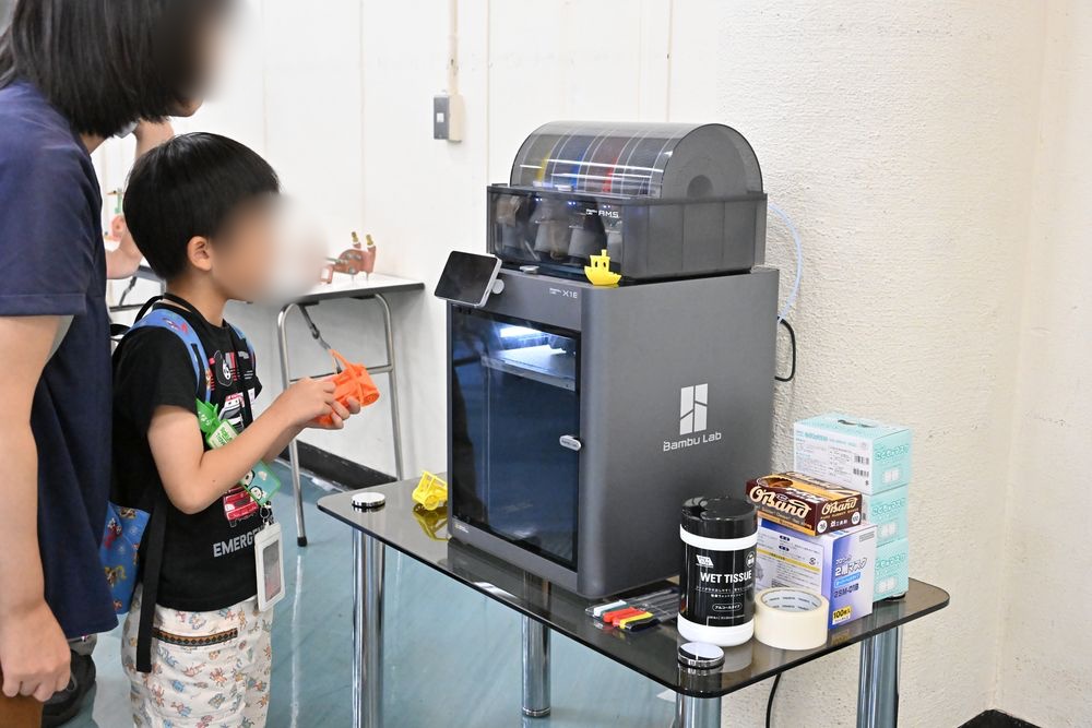 オプテックス工業のプログラムは、子どもたちが自動機で自分だけのオリジナル缶バッチを作るという内容。自ら組み立てたロボットハンドと、紙に描いたデザインをそれぞれ自動機にセット。自動機は内部が見えるようになっていて、子どもたちは自作のロボットハンドが動き、デザインが缶バッチになる様子を食い入るように見つめた。家族と千葉県から訪れた小学4年生の女の子は「完成までの動きが見られて良かった」とうれしそうな表情だった。