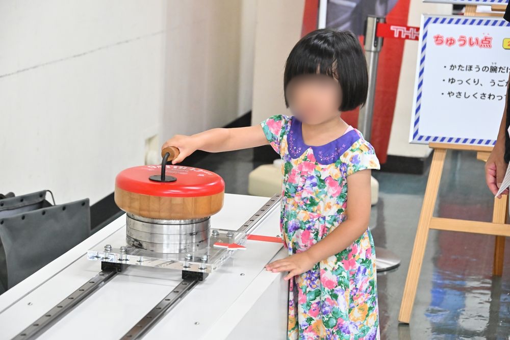 プログラミングとモノづくりを融合した「自動分別ごみ箱」の製作を通じ、自社事業を紹介した。重さの違う空き缶が自動的に予定のトレーに収まると、参加した子どもは飛び跳ねて喜んでいた。リニアモーションガイドによる重量物の移動や、ロボットの遠隔操作ができるコーナーもあり、家族で楽しそうに体験していた。東京都から来た小学3年生の女の子は「思い通りに分別ができてうれしかった」と満面の笑み。