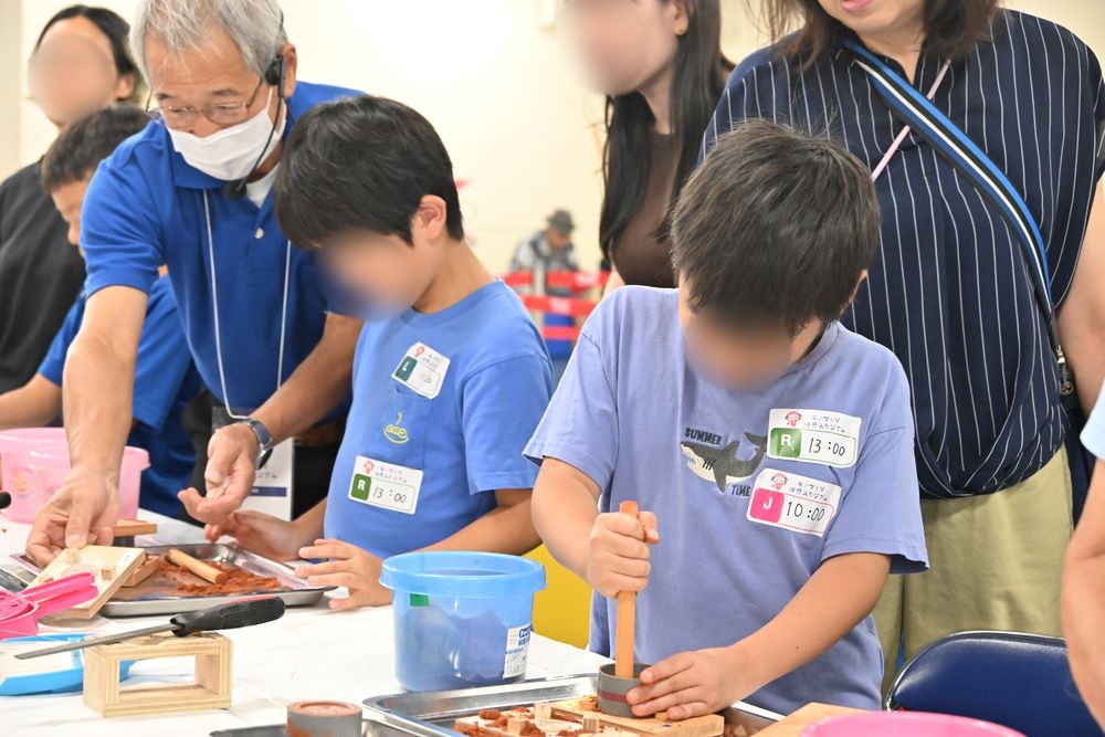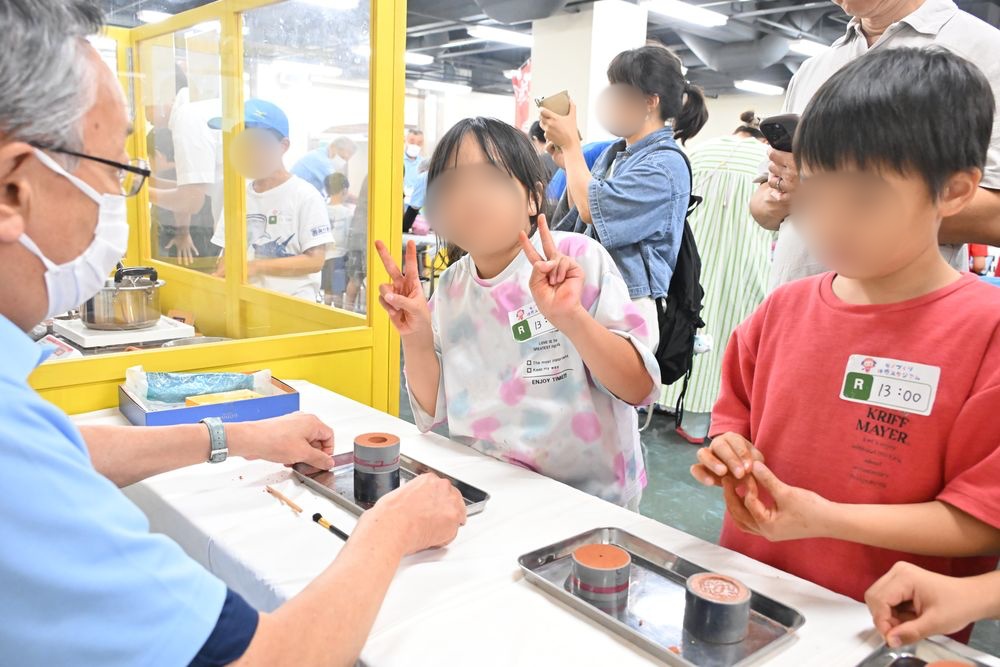 基幹技術の鋳造を再現し、鋳物キーホルダーを作るプログラムを実施した。子どもたちは初めて触れる鋳物の技術に目を輝かせながら、鋳型作りから鋳造までを体験した。自分だけのオリジナルキーホルダーをもって記念撮影するエリアには長い行列もできていた。東京都から来た小学5年生の女の子は「砂型を作るときの容器に砂を詰める作業が大変だったけど、きれいな形のキーホルダーができて良かった」と満足した表情で話した。
